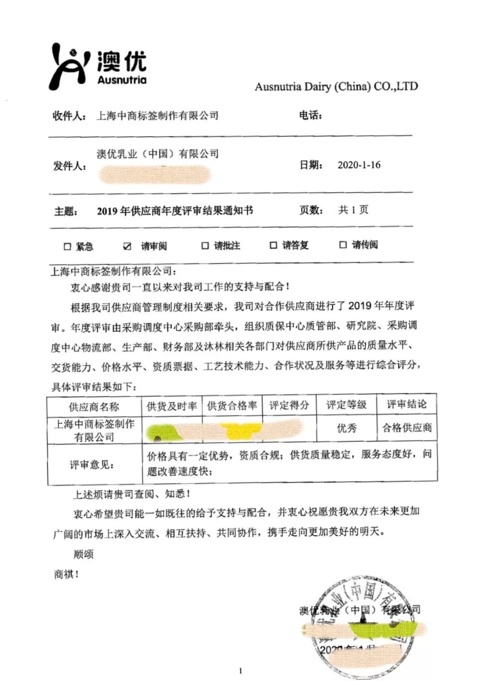 在此次年度评审工作中,CCN中商凭借自身严格的管理体系、稳定优质的服务,快速、顺利地配合澳优完成相关评审工作,连续第3年获评澳优优秀供应商,深受企业赞赏和信赖!